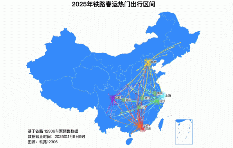从目前车票预售情况看,热门出发城市主要有广州、上海、北京、深圳、杭州、成都、武汉、南京、重庆、长沙;热门到达城市主要有北京、广州、成都、武汉、上海、重庆、长沙、郑州、西安、杭州;深圳至广州、广州至南宁、深圳至长沙、深圳至武汉、苏州至上海、北京至哈尔滨、上海至北京、广州至长沙、天津至北京、广州至重庆等热门区间客流相对集中。